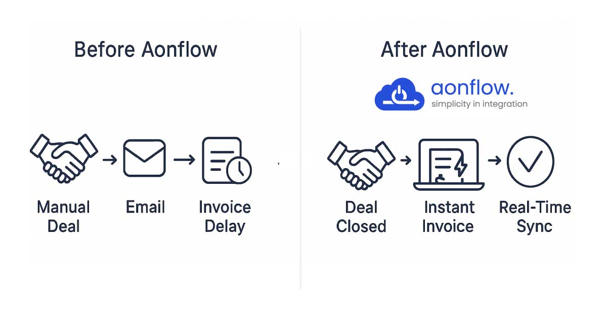 Imagine your sales team uses Dynamics 365, while your finance team manages invoicing in QuickBooks. (Image: Before Aonflow: Manual deal → email → invoice delay After Aonflow: Deal closed → instant invoice → real-time sync) Before Aonflow: